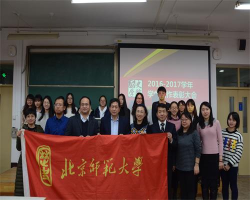 大会首先由姜海军老师宣读2016-2017学年本科生国家奖学金、国家励志奖学金、京师奖学金、专项奖学金、社会奖学金以及三好学生等荣誉称号获得者名单;王卓凯老师宣读2016-2017学年研究生国家奖学金、学业奖学金、专项奖学金、社会奖学金等荣誉称号获得者名单。随后进行大会第二项,陈殿老师宣读白寿彝史学论著奖本科生组获奖名单。大会第三项流程是2017年度学生工作颁奖,在播放历史学院2016-2017学年学生工作回顾展示视频后,郭家宏老师对一年来的学生工作做了总结,并宣读了各项市级及校院两级学生工作教师、集体类奖项获奖名单,郭家宏老师、姜海军老师、王卓凯老师为获奖代表颁奖。湛晓白老师和朱敏老师分别宣读了校级和学院学生工作获奖学生名单。郭家宏老师、姜海军老师、王卓凯老师为获奖代表颁奖,并与获奖代表合影留念。